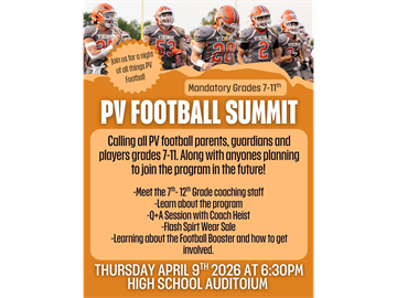 The PVFA will be hosting their annual State of the Program meeting on April 9th in the High School Auditorium at 6:30 pm. All current players and parents are encouraged to attend, as well as any interested players and parents. The meeting is designed to help those better understand the program and the details of the 2026 football season. There will be an opportunity to meet the 7-12 coaching staff as well.