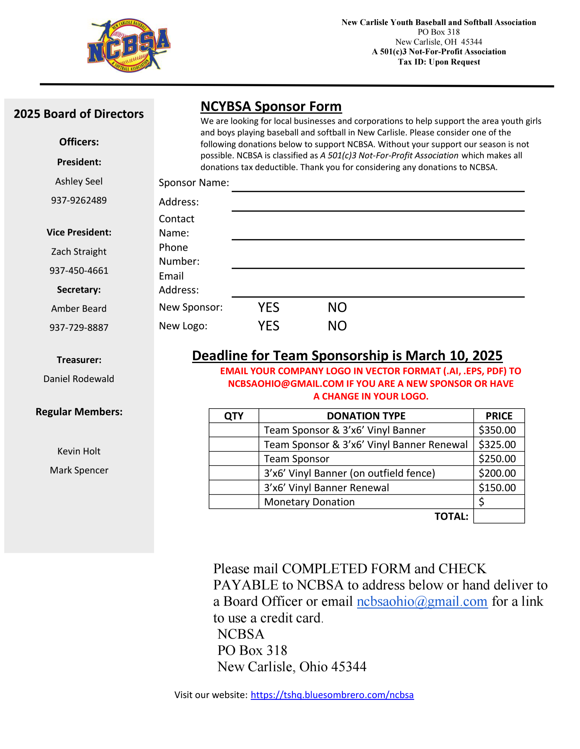 New Carlisle Baseball & Softball Association NCBSA, P.O. Box 318New Carlisle, Ohio 45344