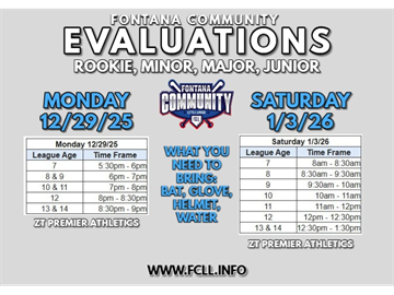 Please check in 30 mins prior to each age group. Players will need their glove, bat, helmet, cleats and water for evaluations. Please see attached league age chart to see which session your player needs to attend.