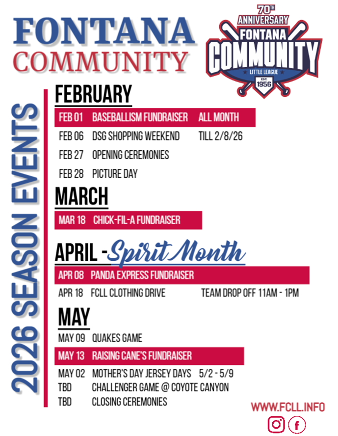 Copyright © 2026 Fontana Community Little League  |  Privacy Statement |  Terms Of Use |  License Agreement |  Children's Privacy Policy |