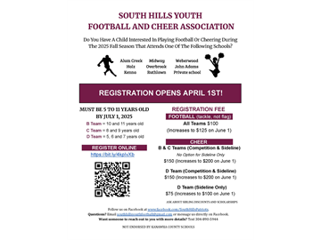 Charleston, W.Va. -- South Hills Youth Football and Cheer is excited to announce that registration for the 2025 season is now officially open. The program invites children across the district to participate in a dynamic, team-oriented experience designed to promote athletic development, team spirit, and community engagement.