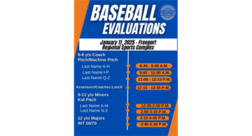 Evaluations for Baseball will be held on Saturday January 11, 2025. There will be a make-up day on Thursday January 9, 2025 for anyone who cannot attend on the 11th, but spots are limited. Check our Facebook page later this afternoon for details regarding make-up times.