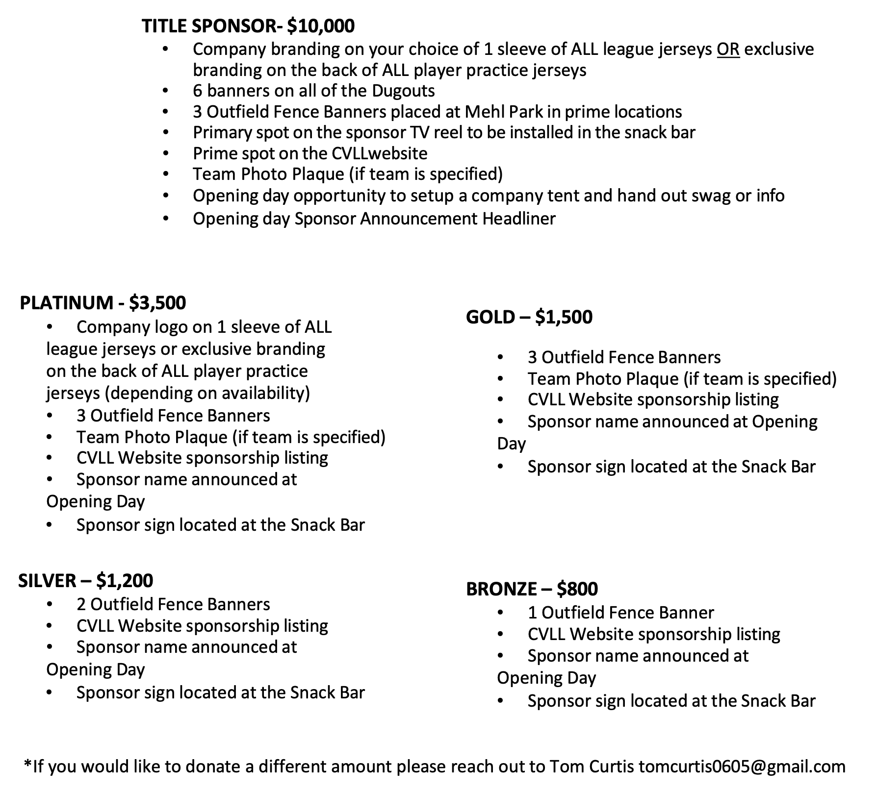 Canyon View Little League Baseball and Softball is gearing up for another season. Your involvement and support makes an enormous difference in providing the best experience for our players! Please review the sponsorship opportunities below and help CVLL have a successful 2025 Baseball and Softball season.