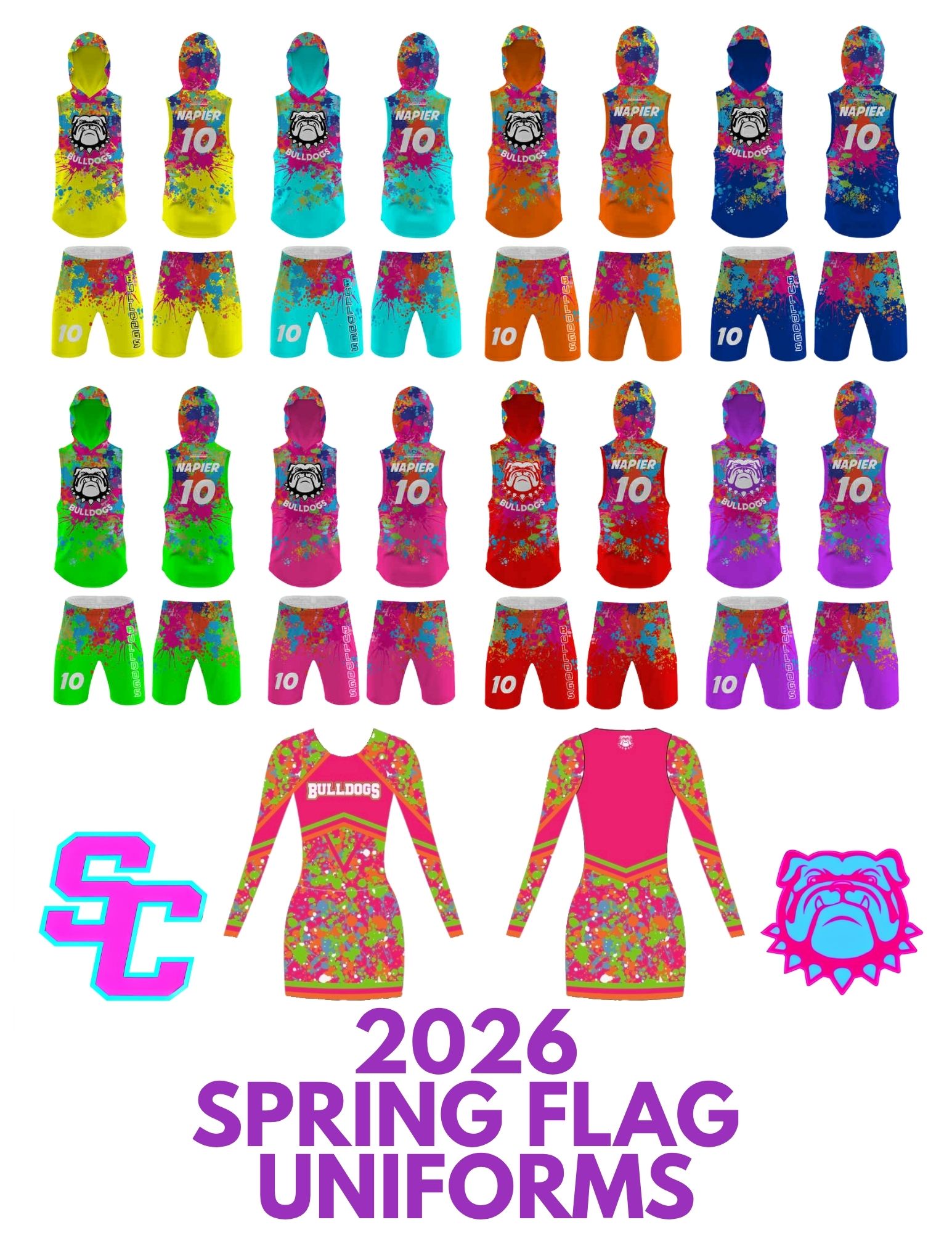 -Cheer- Athletes will need white cheer shoes for game day. Their bow and uniform will be given to them and they will be sized for them in person.