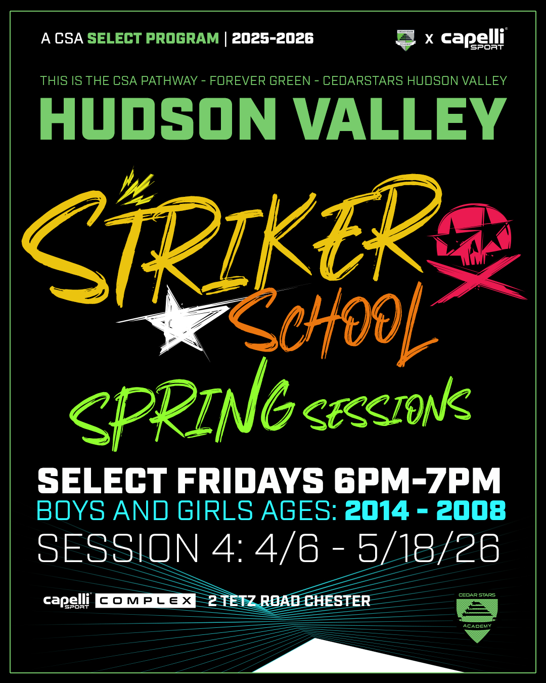 The CSA Hudson Valley Striker School Program is an intensive, striker/forward-specific training program that blends technical, tactical, physical, and mental development to help forwards score more consistently and confidently.
