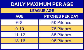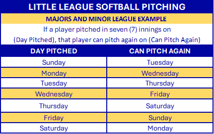 For full details and exceptions, please refer to the official rulebook (Softball): Regular Season Pitching Rules - Little League