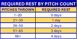 For full details and exceptions, please refer to the official rulebook (Baseball): Regular Season Pitching Rules - Little League