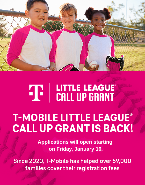 The T-Mobile Little League Call Up Grant is dedicated to helping families in need by covering registration fees associated with their local Little League program. T-Mobile and Little League share the belief that every child should have the chance to experience Little League, regardless of their financial or personal situation. Since 2020, T-Mobile has helped cover registration fees for over 70,605 families through the Call Up Grant.