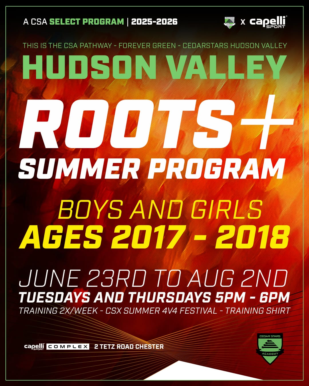 CSA Hudson Valley Roots+ is designed and curated for U8/U9 players, providing real, age-appropriate training that builds technical skill, confidence, and a genuine love for the game.