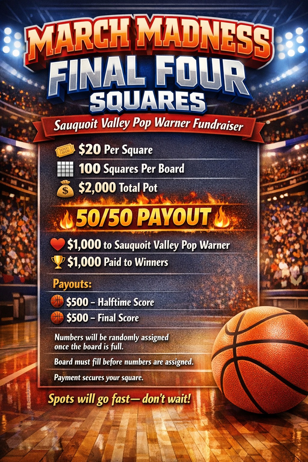 Our March Madness Final Four Squares Fundraiser is still going strong! Thereβs still time to get involved and support our program while enjoying the excitement of the tournament. Be sure to grab your squares before they fill up!