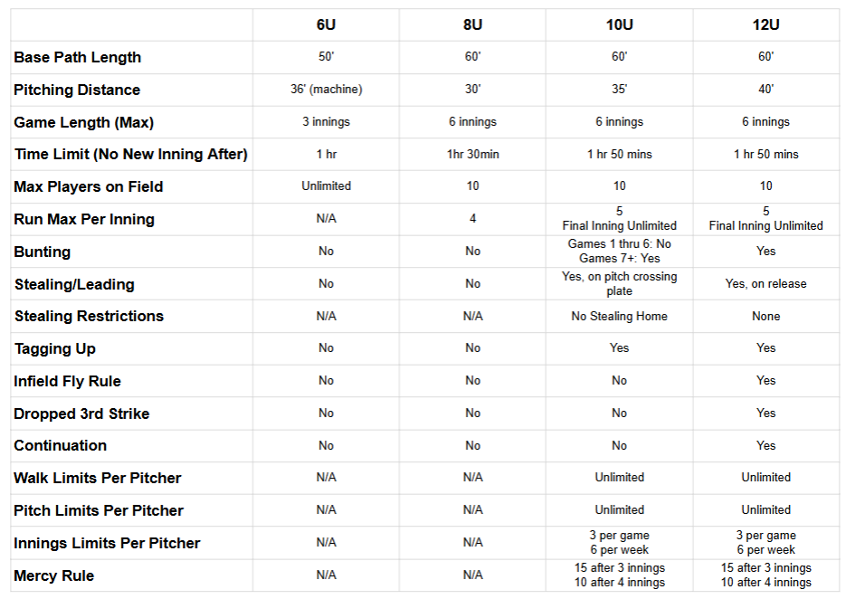 1. Games are 6 innings max. No new innings start after 1 hour 30 minutes.
